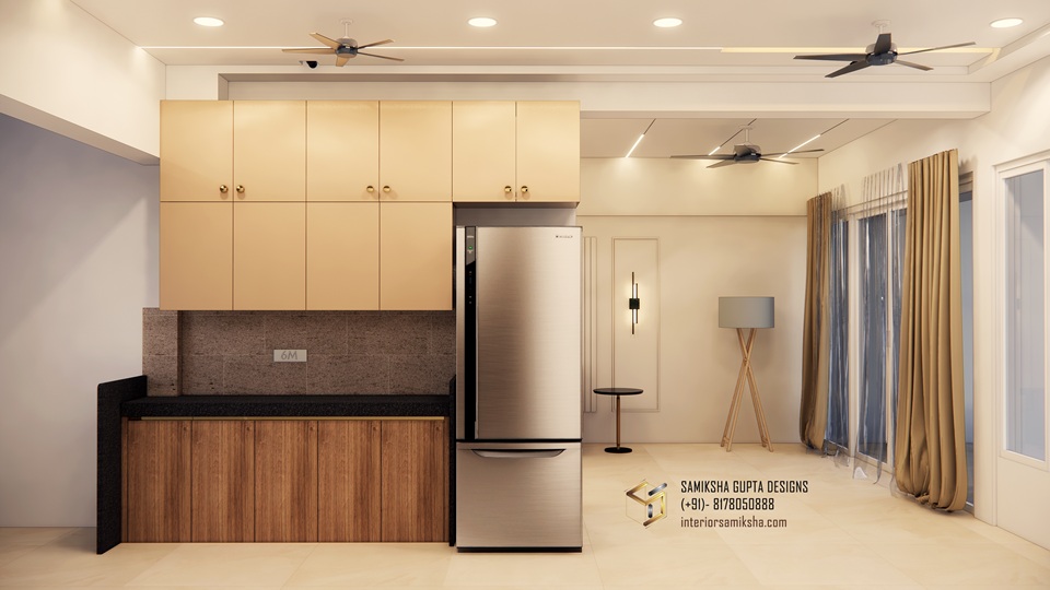 The colour scheme revolves around soft beige laminates paired with a dark granite countertop and textured backsplash tiles. The beige tones bring in warmth and openness, while the granite adds a grounding contrast and durability that’s ideal for daily kitchen use.